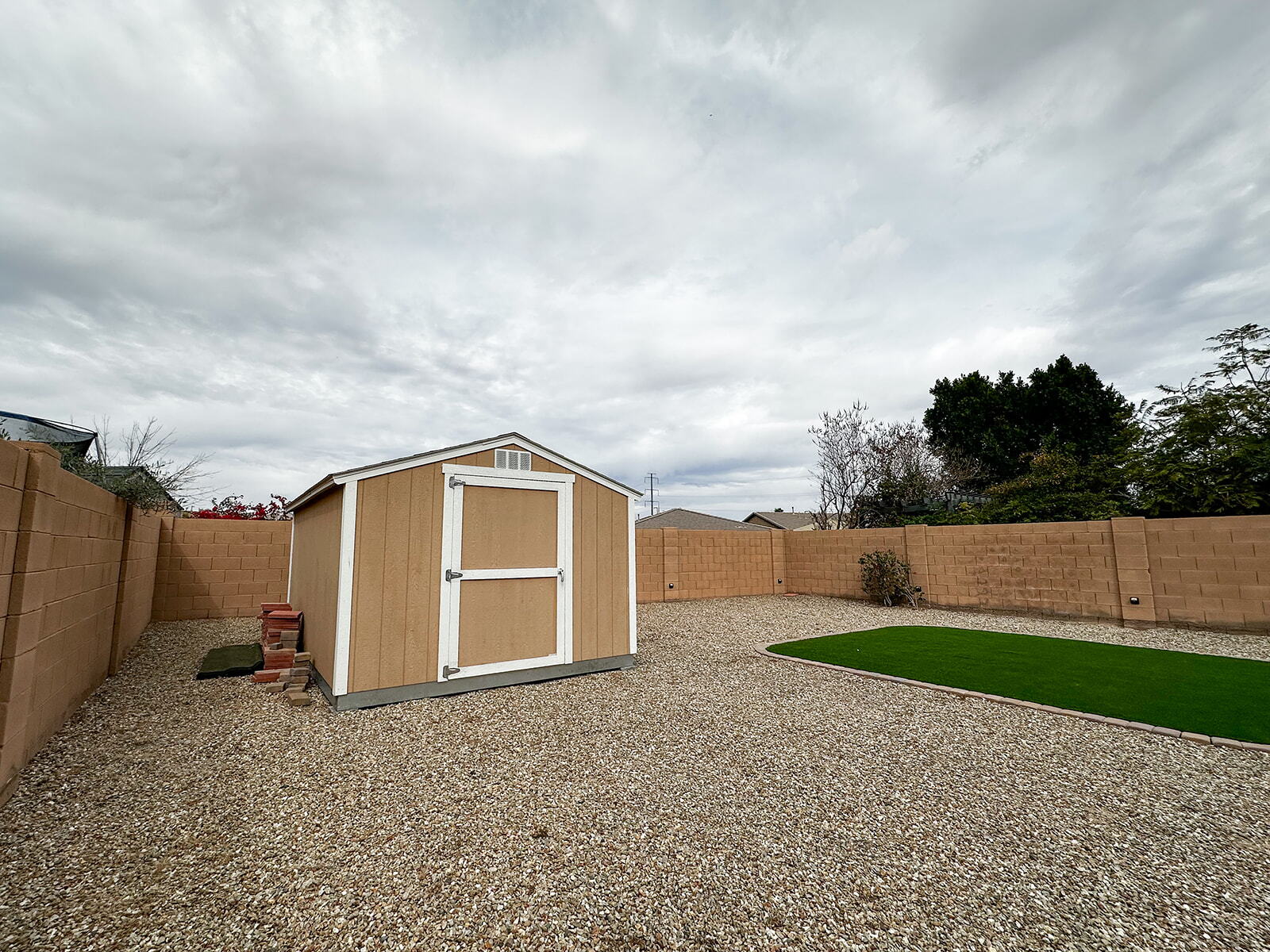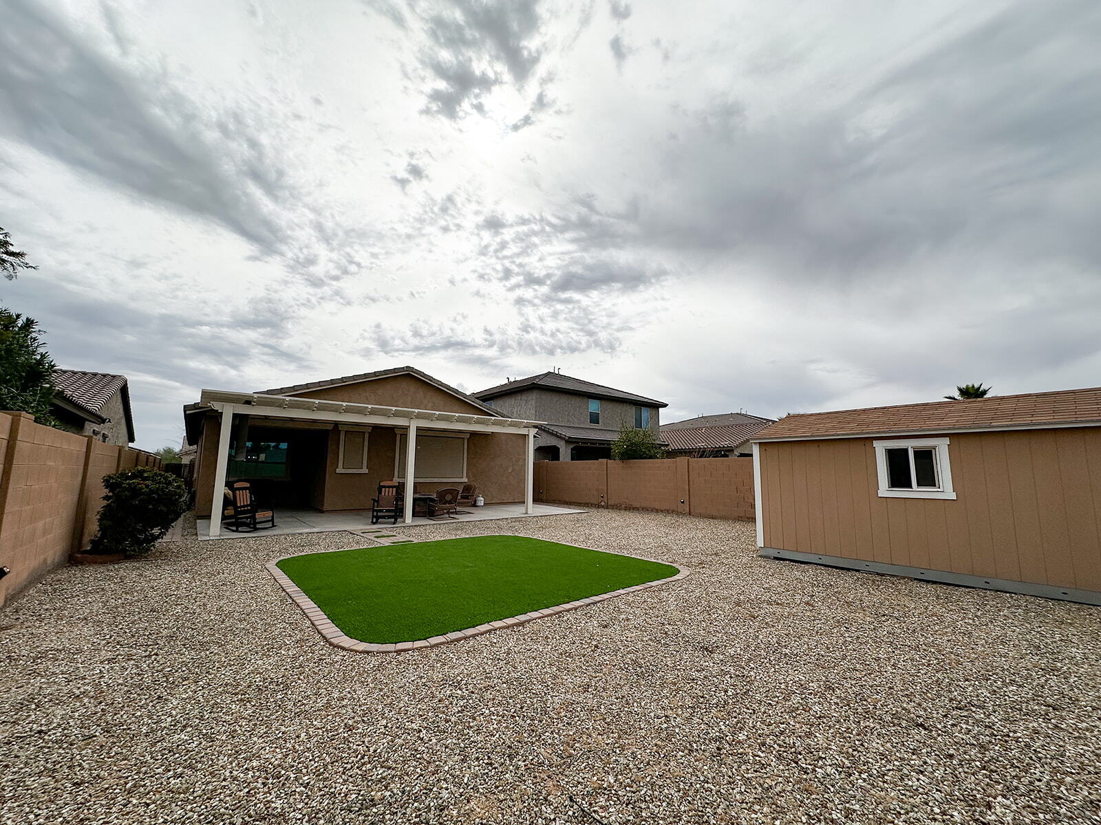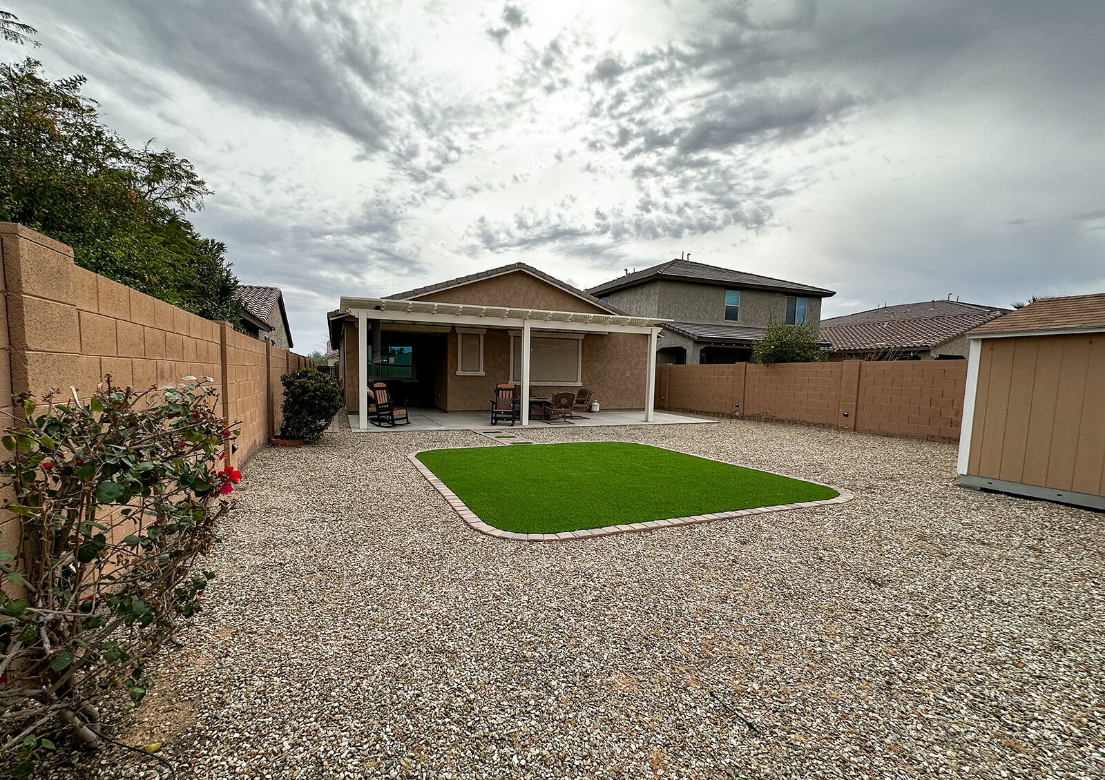 bedroom, 2-bath home, 1,775 Sq Foot Single story in the desirable Rancho El Dorado First Development as you enter Maricopa / This well-designed split floorplan offers a large primary suite for added privacy and comfort / The spacious kitchen features a BIG CENTERED ISLAND, abundant cabinetry, and a walk-in pantry, perfect for cooking and gatherings / SUNSCREENS throughout / The backyard includes a COVERED PERGOLA ideal for relaxing or entertaining / spacious yard along with a shed for extra storage / A water softener is also included, adding everyday convenience and overall value to this beautiful home